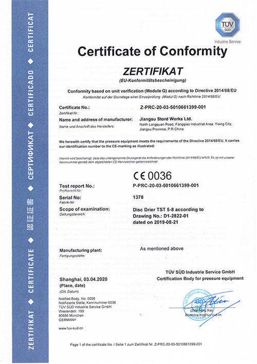 2020-08-29150T/D 500平方斯道德圓盤式干燥機發(fā)運德國